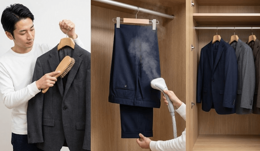 日々の手入れは、帰宅後にブラッシングしてホコリを落とし、ポケットを空にしてからハンガーに掛けます。肩先が厚いハンガーを使うと、形が崩れにくいです。パンツは吊るして重みでシワを伸ばし、週に一度は軽くスチームを当てると整います。クリーニングは頻繁に出しすぎず、汗をかいた時や汚れが気になる時に絞ると長持ちします。