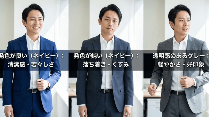 若々しさにも直結します。青みのあるネイビーや、透明感のあるグレーは、姿勢や表情を軽やかに見せやすく、年齢を問わず好印象につながります。反対に発色が鈍い生地は、落ち着きは出ますが、照明によってはくすんで見えることがあります。用途に合わせて、明るさの度合いを調整すると失敗しにくいです。