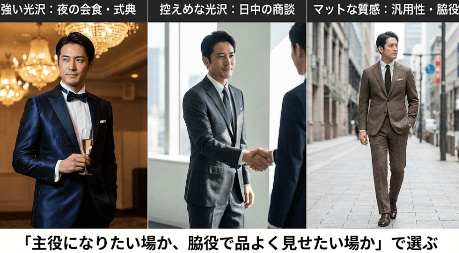 光が当たりやすい夜の会食や式典では、艶があると肩やラペルに陰影が生まれ、立ち姿がきれいに見えます。反対に日中の商談やオフィスでは、艶が強いと目立ちすぎることがあるため、しっとりした艶にすると信頼感が保てます。