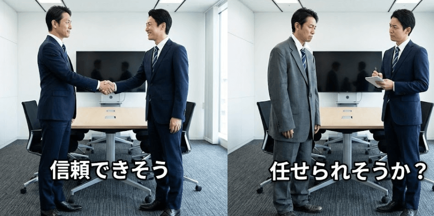 人は会話が始まる前に、相手を「信頼できそうか」「任せられそうか」で無意識に判断します。最初の数秒で、姿勢、肩の収まり、スーツの清潔感、靴の手入れまでが視界に入り、評価の土台が固まります。