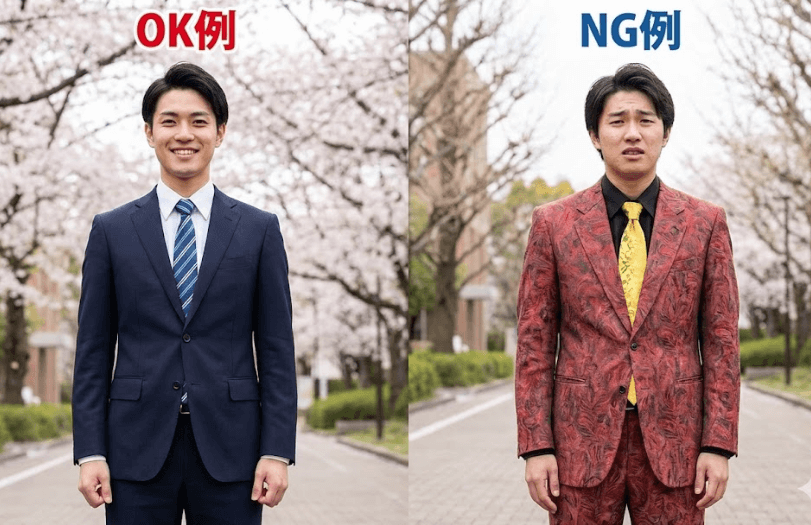 入学式では、清潔感を保ちながら学生らしい若々しさを演出することが大切です。堅苦しいビジネススーツに寄りすぎると、場に合わない印象になってしまうことがあります。